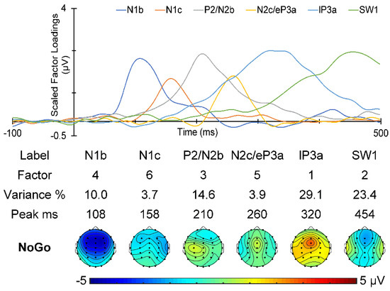 The No-Go t-PCA identified six components carrying more than 1.5% of the variance each, for a total of 84.8% variance. Their scaled factor loadings and topographies are shown in Figure 7. Their characteristic latency and topography [2,4,7,29,30] identified No-Go components in temporal order: N1b, N1c, a composite P2/N2b, a composite N2c/early P3a (eP3a), a late P3a (lP3a), and an SW1.