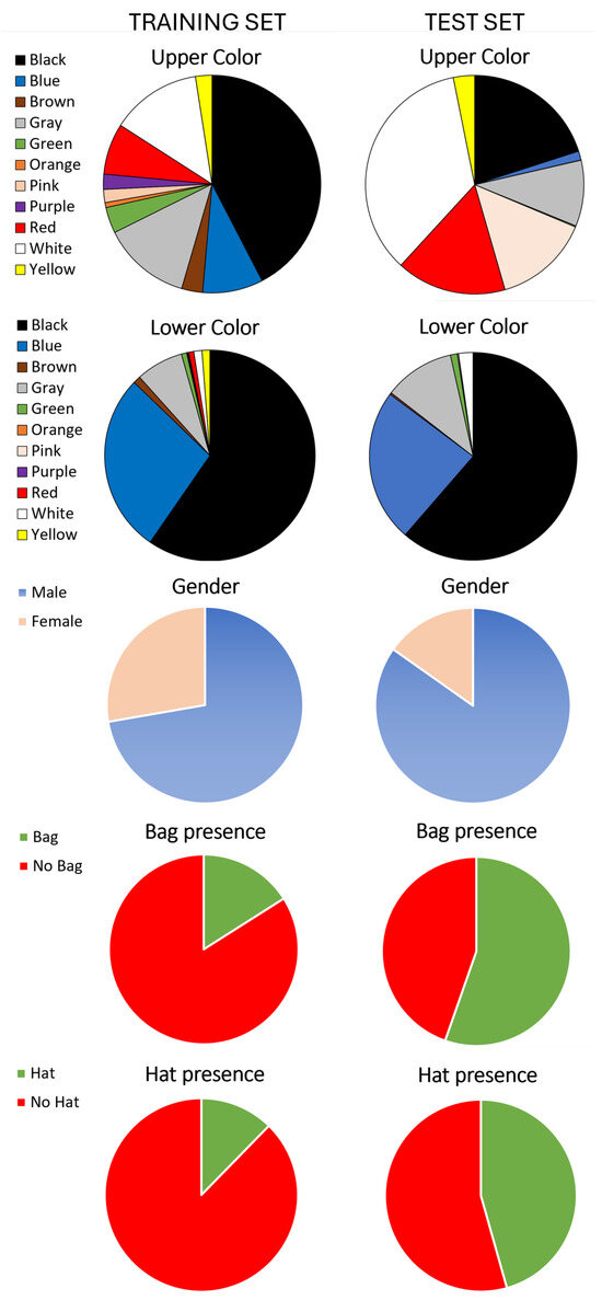 The following attributes were considered: color of clothing (both upper and lower), the gender, the presence of the bag and the presence of the hat. Note that such attributes are very important in several application domains, such as surveillance, forensic search, or retail analytics. They can help, for instance, in visually distinguishing people in case it is required to locate missing persons or in case law enforcement requires quickly filtering surveillance footage based on specific criteria to locate a suspect (i.e., the suspect is a man with a hat, wearing a white t-shirt). Furthermore, in retail analytics, understanding the demographic and the presence of bags can influence marketing strategies and store layouts.