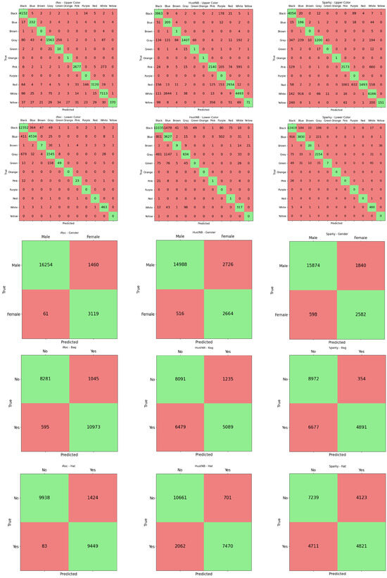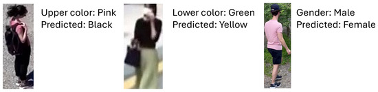 Analyzing the confusion matrices in Figure 3, we observe that the winner achieves more balanced accuracy than the other two contenders not only between the various tasks but also on the various classes of the specific tasks. This behavior is evident especially in the three binary tasks, namely gender, bag and hat recognition. On the two color classification tasks, we note that the errors in the iROC-ULPGC model are more explainable and regular. For example, on the upper color classification the confusion is mainly between similar colors (e.g., gray with white, black, blue, green; pink with white; red with purple) or with black (typical situation in images with shadow); on the lower color classification, the situation is even better, with errors mainly between black, blue and gray. The others make more varied errors, even when the accuracy on the task is comparable: the SPARKY team method achieves, on lower color classification, similar accuracy to the winner’s method (0.904 vs. 0.908) but, for example, confuses green with white. The errors are more related to the distribution of the samples in the training set than to the similarity between the classes involved in the misclassification. Qualitative examples of the errors conducted by the iROC-ULPGC model are reported in Figure 4; the errors are explainable by occlusions, similarity between the classes and clothes type. We can, therefore, note that the large amount of data used to train the iROC-ULPGC model also helps in stabilizing the results, with more understandable errors between the classes of interest; the other contenders have not considered these aspects of balancing between tasks and between classes of the same task in their training procedures.