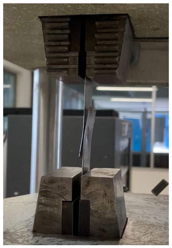 Tensile tests were performed with a Tinus Olsen testing machine with a maximum load capacity of 300 KN and a resolution of 0.1 N. For the pull test, the metal plates were aligned between two V-shaped jaws with a knurling that prevented the parts from being displaced during the test (Figure 3). Subsequently, the maximum pull force value was recorded when the welded parts reached the breaking point due to the applied force.