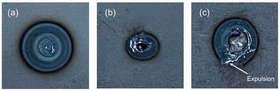 After testing, the nugget diameter was measured with an electronic caliper with a resolution of 0.01 mm and categorized into good, bad, and expulsion samples (Figure 4). The “expulsion” classification was selected because it impacts the functional performance of the fusion since part of the material is splashed out of the welding area, weakening the joint.