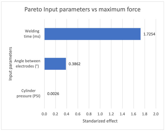 A total of 495 samples—falling into three categories: bad, good, and expulsion—were built with the combinations of the established parameter range in a complete factorial design of experiments (Table 2). Among them, 32 samples were built with a random combination of the parameters to avoid data bias and to evaluate the influence of the input parameters of welding time, electrode pressure, and angle between the electrodes with the mechanical maximum force. To create “bad” samples, a combination of low and high setups of the cycle time and 15º angle between electrodes were set. For the “good” examples, the central parameters of the cycle time and a 0º angle between electrodes were used. Finally, the “expulsion” samples were created with the parameters of long welding time and 15º angle between electrodes. Each sample was labeled with an identification number to maintain the traceability of the used parameters for its production to integrate the information into the dataset.