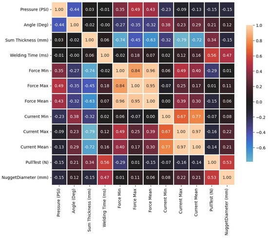 To evaluate the relation between the mechanical properties, such as mechanical strength, and the variation of input parameters, ref. [15] monitored the current, voltage, electrical resistance, and electrode pressure during the exploration of the feasibility of welding two steel materials, Quenching and Partitioning (Q&P) and Transformation-Induced Plasticity (TRIP). They reported that welding current, electrode force, and welding time were key parameters influencing weld quality. However, they can estimate this through expensive adjustments to the machinery.