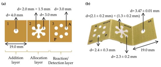 3D μPADs were designed by creating hydrophobic ink patterns printed on hydrophilic cellulose substrates using a wax printer. The 3D μPAD design is shown in Figure 1. It consists of three square layers: addition layer (1), allocation layer (2), and reaction/detection layer (3) (19.0 mm × 19.0 mm each). First, layer (1) includes a circular shaped (d = 4.0 mm) hydrophilic area, used as the inlet for blanks, standards, or samples. Second, layer (2) includes a circular shaped (d = 4.0 mm) hydrophilic area aligned in position with the hydrophilic part of layer (1) and six circular hydrophilic areas (d = 3.0 mm) connected to the central zone by hydrophilic channels (2.0 mm long and 1.5 mm wide). Finally, layer (3) has six circular hydrophilic areas (d = 3.0 mm) aligned in position with layer (2). On this last layer, the dry reagents for colorimetric determination are pre-deposited.