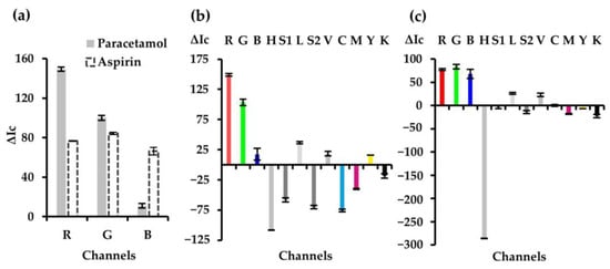 The selection of the most appropriate RGB color channel was first performed. For this purpose, the experiments were performed both in the absence (blank) and presence of the target analytes. As shown in Figure 2a, the R channel provides the maximum analytical response for paracetamol and the G channel for aspirin. These results were expected since, for paracetamol, an absorption band at around 748 nm (red range) was obtained due to the blue product formed. In the case of aspirin, an absorption band at 522 nm (green range) was obtained due to the purple/pink complex formed. In addition to confirming this, the rest of the channels (CMYK, HSL, HSV) shown in Figure 2b,c were also tested.
