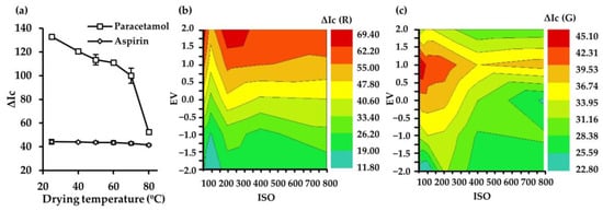 Effect of drying temperature of the colorimetric reagents on the analytical response (a). Effect of digitization parameters (ISO and EV) on the analytical response for the colorimetric determination of paracetamol (b) and aspirin (c).