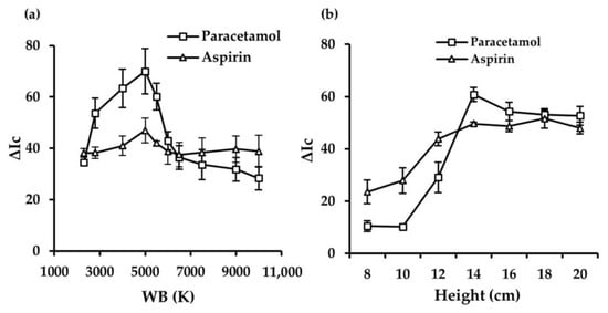 Effect of WB values for paracetamol and aspirin with ISO and EV fixed (a). Optimization of image acquisition height for paracetamol and aspirin with ISO, EV, and WB fixed (b).