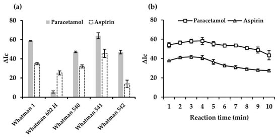 The aim of this study was to evaluate the reaction stability and optimize the drying temperature of the colorimetric reagents deposited on the cellulose substrate. Therefore, temperatures in the range of 25–80 °C were tested. As shown in Figure 3a, a negative effect on the analytical response was observed as the temperature increased for paracetamol. In the case of aspirin, the analytical response did not vary significantly in the tested range. Thus, a drying temperature of 25 °C was selected as a compromise for both analytes.