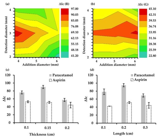 Effect of the diameter of addition and detection layers of μPAD on the analytical response for the colorimetric determination of paracetamol (a) and aspirin (b). Optimization of thickness (c) and length (d) of the hydrophilic channels in the allocation layer.