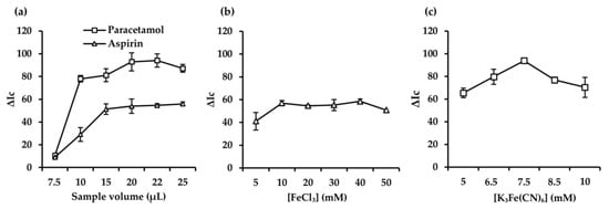 The added amount of FeCl3 in the reaction medium plays an important role in aspirin detection, as it directly influences the color intensity signal and the process of complex formation with the resulting analytical response [29]. To study the effect of this parameter, 5 µL of FeCl3 solution at different concentrations (i.e., 5–50 mM) was deposited in the detection reservoir of the 3D µPAD. As shown in Figure 7b, the analytical response (ΔIc) increased until reaching a maximum at FeCl3 20 mM and remained constant up to a concentration of 40 mM. For higher FeCl3 concentrations, a decrease in the analytical response was observed, which can be attributed to the formation of a precipitate on the cellulosic substrate, hence preventing the correct determination of the target analyte.