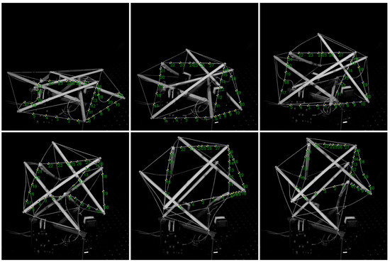 AI−powered dynamic motion tracking of points in a tensegrity structure. Unlike conventional methods, the deep learning-based approach can accurately track all points of interest. The images were captured at 6600 fps, and the frame interval of the six representative images shown here is 200.
