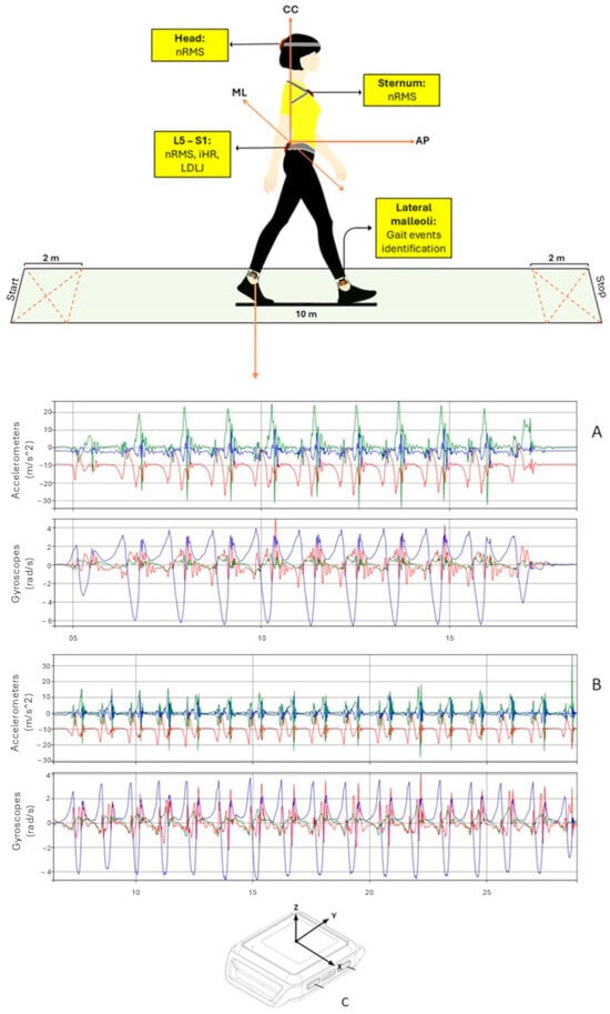 Acquisition protocol and IMUs placement. nRMS, normalized root mean square of the acceleration signals; iHR, improved harmonic ratio; LDLJ, log dimensionless jerk score. CC, ML, AP, craniocaudal, mediolateral, and anteroposterior components of the signals, respectively; (A), example of accelerations and angular velocity signals derived from the left leg of a healthy subject; (B), example of accelerations and angular velocity signals derived from the left leg of a TBI survivor; (C), axes orientation.