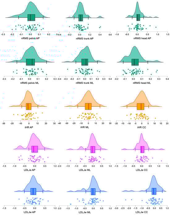 Distributions of the test-retest differences within the sample. Combined density, boxplot, and scatterplot representations of normalized root mean square (nRMS) values, improved harmonic ratios (iHR), and log dimensionless jerk score of accelerations (LDLJa) and angular velocities (LDLJw) across anteroposterior (AP), mediolateral (ML), and craniocaudal (CC) directions. Each plot consists of a density plot, indicating the distribution of values; a boxplot, summarizing the median and interquartile range; and a scatterplot, displaying individual test-retest differences to reflect underlying variability. The x-axes represent the test-retest differences for each respective metric, while the y-axes show the density estimates for the distribution of differences.