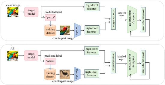 The encoder, which is the target model excluding the last fully connected layer and output layer, extracts high-level features from each instance. Two types of feature pairs are created: (1) a similarity pair (two benign samples belonging to the same class, labeled as 0, top panel of Figure 2); and (2) a difference pair (one benign sample and one adversarial sample with the same predicted label, labeled as 1, bottom panel of Figure 2). These pairs are fed into the similarity measurement model D, which is optimized using cross-entropy loss. A dropout strategy is adopted for the two hidden layers during training. This training approach enables the model to effectively measure semantic similarity for a pair of images with the same predicted labels.