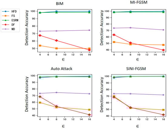 The results are shown in Table 2 and Figure 3. It can be seen that the proposed method significantly outperforms the FS, DF, and MD detection algorithms in detection accuracy and achieves comparable accuracy to the ESRM detection algorithm on the target model ResNet-50. Notably, as the intensity of adversarial attacks increases, the detection accuracy of the FS, DF, and MD algorithms shows a clear downward trend, with the maximum drop reaching 27.17%. In contrast, the detection accuracy of the proposed method remains relatively stable, indicating strong robustness against varying attack intensities. Furthermore, as can be observed from Table 2 and Figure 3, although the detector is trained with BIM adversarial examples with ϵ = 4, the detection accuracy of the proposed method remains relatively stable across different attack types and different magnitudes of disturbance, demonstrating good robustness against attacks.