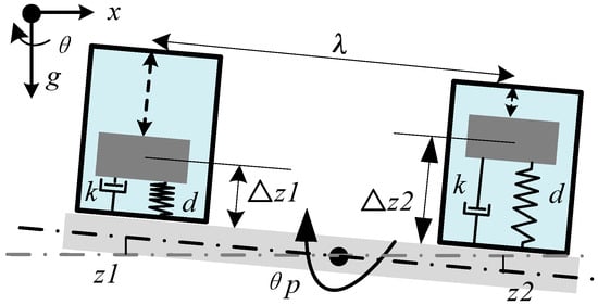 The differential-mode method requires two vertical inertial sensors that are placed at a specific distance in the platform, as show in Figure 1. The symbols z1 and z2 denote the vertical displacements of the platform where the inertial sensors are located; Δz1 and Δz2 are the relative displacements between the proof masses and the platform; λ represents the distance between the two proof masses; k1, k2, d1, and d2 are the stiffness and the damping coefficient of the left and right inertial sensors; m1 and m2 represent the masses of the proof mass, and θp represents the tilt angle of the platform.