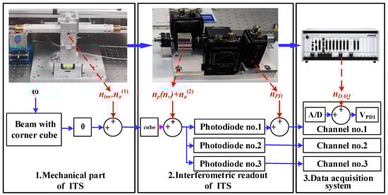 Figure 5 illustrates the noise contribution diagram for the ITS measurement process. The ITS structure is composed of three primary components: the mechanical oscillator, the interferometric readout, and the data acquisition system, which are the main sources of noise in the ITS. The diagram uses various color-coded lines to represent different aspects of the system. The main noise sources shown in the figure are as follows: ntm for thermal-mechanical noise, na for ambient noise, and nv for laser frequency noise; the laser frequency noise was estimated based on the data from the laser user manual. Although low-frequency noise is not directly provided in the datasheets, we used available data and theoretical models to estimate the laser frequency noise in the 0.01–0.1 mHz range. np is for phase noise concerning the laser frequency noise; nPD is for photodiode noise, and nDAQ is for data acquisition noise. Indexes (1) and (2) present the same type of noise with different values.