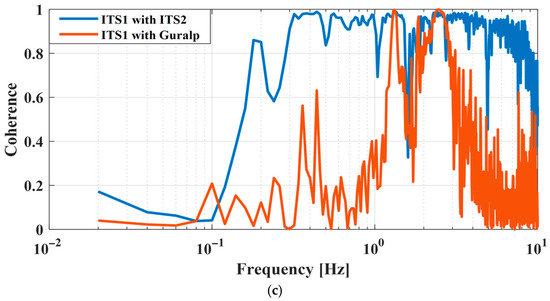 Figure 9 illustrates the noise floor comparison, clearly demonstrating the superior sensitivity of the ITS over the commercial sensors. Figure 9a shows the frequency spectra of these three sets of platform tilt signals. The identical frequency spectra observed across all three datasets indicate that the two self-developed ITS equipment measure platform tilt signals with the same fidelity as the commercial sensor within the 0.5–3 Hz range. This similarity in spectral response underscores the accuracy of the self-developed ITS equipment in measuring platform tilt. Nevertheless, at frequencies above 3 Hz, the Guralp differential-mode signals are contaminated by ground noise, rendering it infeasible to measure lower tilt signals. Below 0.5 Hz, the ITS is affected by its resonant frequency of 0.25 Hz, leading to an enhanced sensitivity and discrepancies when compared to platform tilt signals captured by the Guralp differential-mode model. To substantiate the precision of ITS measurements within this frequency range, we analyzed the outcomes from the two ITS devices that showed matching amplitude–frequency curves over the full spectrum of frequencies. This evidence suggests that both ITS sets respond identically when excited by the platform signals, demonstrating excellent correlation at frequencies above 0.2 Hz.