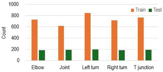 The distribution of the pipeline feature dataset is shown in Figure 3. The dataset consists of five classes, which are elbow, joint, left turn, right turn, and T-junction. Images were labeled manually for pipeline feature recognition. To evaluate the machine learning model and escape over-fitting of the model, the dataset is approximately separated into 80% training images and 20% test images. Slight variations exist to ensure even test samples and to maintain integer sample counts during partitioning. These adjustments help provide a fair and reliable performance evaluation across all classes.