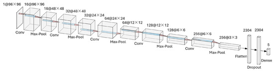 The architecture of the selected model is illustrated in Figure 4. It consists of five convolutional layers, each with a kernel size of 3, followed by max pooling layers with a stride of 2. The model also includes a flatten layer to prepare the data for subsequent dense layers, a dropout layer to prevent overfitting and a final dense layer for classification. The model is trained using categorical cross-entropy loss, which is standard for multi-class classification tasks. The functionality of each layer is detailed below.