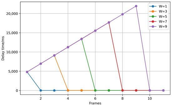 The delay time for different W values is analyzed in Figure 6. The results show that a larger W increases the initial delay, as more frames are needed to establish a stable prediction. However, once enough frames have been processed, the delay stabilizes since the time required to determine the most frequent feature remains nearly constant. Additionally, W influences the smoothness of feature transitions. When a feature change occurs, a larger W extends the transition period, requiring more frames and leading to a longer adjustment time.