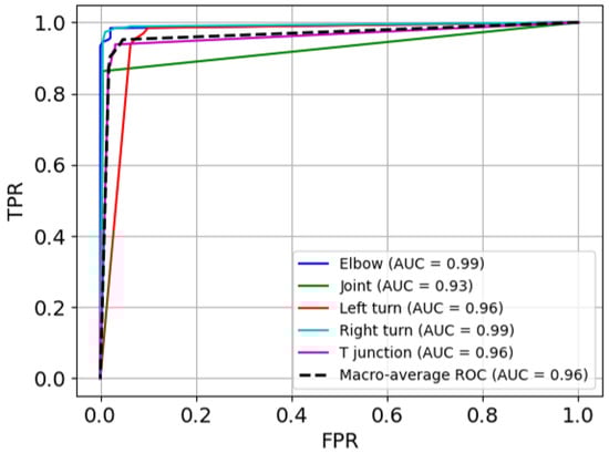The ROC curves of the model are presented in Figure 7, illustrating its overall efficacy in feature classification and its discriminative performance across all categories. The macro-average AUC is 0.96, signifying excellent and robust overall performance. Notably, the elbow and right turn categories achieve near-perfect AUC values of 0.99, demonstrating the model’s strong classification capability for these classes. The left turn and T-junction categories also perform well, with AUC values of 0.96. However, the joint category exhibits a slightly lower AUC of 0.93, indicating a relative challenge in distinguishing it from other categories.