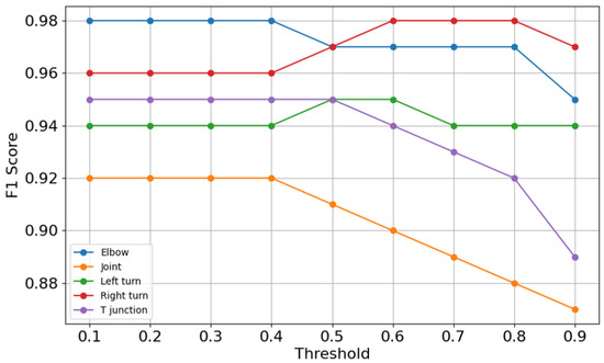 Figure 8 and Figure 9 offer insights into each category’s F1 score and overall F1 score that evolve with varying thresholds respectively. Threshold and W serve different purposes. The threshold defines the minimum confidence required for a neural network to make a prediction. In contrast, W determines the size of the sliding window, which helps reduce misclassification effects by smoothing predictions across consecutive samples. In Figure 8, it can be seen that each category keeps stable F1 score before the threshold of 0.4. After the threshold of 0.4, each category performs differently: joint and elbow drops, while right turn and left turn have temporary rises and T-junction shows a decline after the threshold of 0.5. These findings confirm that setting a threshold too high undermines the model’s ability to classify features correctly, particularly for less robust categories like joint.