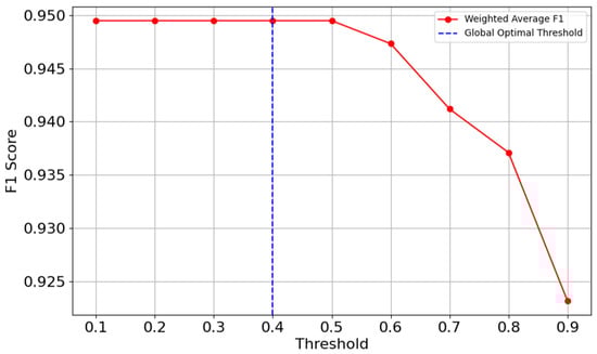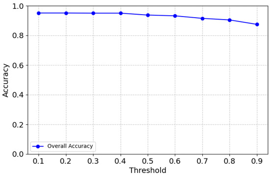 The overall accuracy of the model is shown in Figure 10. The graph shows that the model maintains a high and stable accuracy between thresholds 0.1 and 0.4, with a slight decline beyond the threshold of 0.4. This trend is consistent with the weighted F1 score and individual class performances, reinforcing that 0.4 is the most balanced threshold. Beyond the threshold of 0.6, accuracy drops more sharply, likely due to the model becoming overly conservative, leading to higher false negatives.