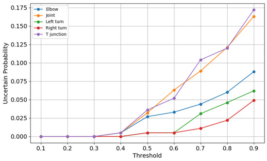 Figure 11 shows the uncertainty across a range of thresholds, revealing the model’s confidence levels across thresholds. At lower thresholds, the uncertainty probabilities are zero, indicating that the model is confident in its predictions. However, as thresholds increase, uncertainty grows sharply, particularly for joint, elbow, and T-junction. This finding suggests that higher thresholds introduce ambiguity, especially for categories with weaker separability. The rising uncertainty aligns with the declining F1 scores and accuracy observed at higher thresholds, further emphasizing the importance of selecting an optimal threshold.