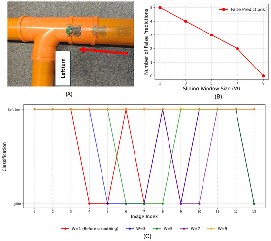 The model with a threshold of 0.4 was exported as an Arduino library and deployed on the Joey robot. To evaluate the performance of the sliding window smoothing method, the robot was tested in a pipe containing a left turn. The experimental pipe setup and the comparative outcome are depicted in Figure 12. The robot Joey moved in the direction of the red arrow. The detection results were recorded both before and after applying the smoothing technique. The figure demonstrates that the sliding window smoothing method effectively reduces misclassifications arising from individual frame predictions.