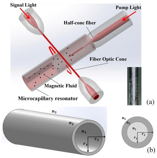 Lastly, the processed microcapillary resonator is filled with magnetic fluid (Particle radius: 10 nm–30 nm, Macklin Biologics Co. Ltd., Shanghai, China) and sealed at the bottom. A prefabricated fiber with no coating is then stretched into a micro–nano fiber with a diameter of approximately 2 μm [24]. This fiber is cut into two halves, and one section of the half–cone fiber is selected. It is inserted into the fluid channel of the microcapillary resonator to serve as a transmission mediator for pumping optical input, as shown in Figure 1.