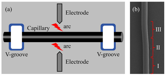 To begin, a section of capillary tube is taken (outer radius: 161 μm/80 μm, inner radius: 128 μm/58 μm, wall thickness: 33 μm/22 μm, Ronglipu Scientific Instrument Co. Ltd., Jiangsu, China) and the coating layer on the outside of the tube is burned off with a hydrogen–oxygen flame from the fusion cone drawing machine. The tube is then wiped clean with alcohol. The processed capillary tube is fixed in two V–shaped grooves of the fiber optic fusion splicer (Fujikura FSM–40S) between the middle two electrodes, as shown in Figure 2a. By using the arc discharge and traction force of the fiber optic fusion splicer, the capillary tube structure is made concave. The degree of concavity is adjusted by regulating the discharge current and the number of discharges. The microcapillary resonator is divided into three regions (I, II, III), representing the normal smooth region, the super smooth region, and the depressed region, as shown in Figure 2b. Due to the melting and settling of the fiber material caused by the discharge operation, region II has an ultra-smooth surface. Only the ultra–smooth region (II) can support ultra–high Q WGMs among these three regions [23].