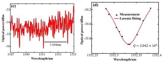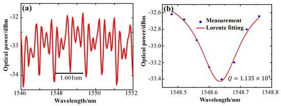 The quality factor Q value is a fundamental characteristic parameter of an optical microcavity. In this study, the resonant spectral characteristics of a large–sized microcapillary resonator with an inner radius of 128 μm, an outer radius of 161 μm, and a wall thickness of 33 μm were tested for the first time. A tapered fiber, with a tapered waist diameter of about 2 μm, was used to excite the resonant spectrum of the microcapillary resonator. Figure 3a displays the spectra obtained by coupling the tapered fiber with the microcapillary resonator. The figure indicates that the resonant mode of the microcapillary resonator can be clearly excited, and the spectral lines are neat and regular. The theoretical value of the free spectra range (FSR) of the microcapillary resonator can be calculated by the formula , where is the resonant wavelength and is the group velocity refractive index. To simplify the calculation, the refractive index value of the microcapillary material is used instead. The FSR of the microcapillary resonator of this size is 1.601 nm, and the FSR calculated by the theoretical formula is 1.645 nm, and these are very close to each other. In the analysis of the microcapillary resonator, the Q value can be estimated using the equation [25], where is the central resonant wavelength and is the half–height full width of the resonant spectrum. Figure 3b is the result of the Lorentz fitting taken from the resonance spectrum of Figure 3a at the central wavelength of the resonant peak near 1548.634 nm. The half–height full width of the resonance spectrum is 0.1365 nm, and the Q value of the resonance mode is by the above Q value calculation formula.