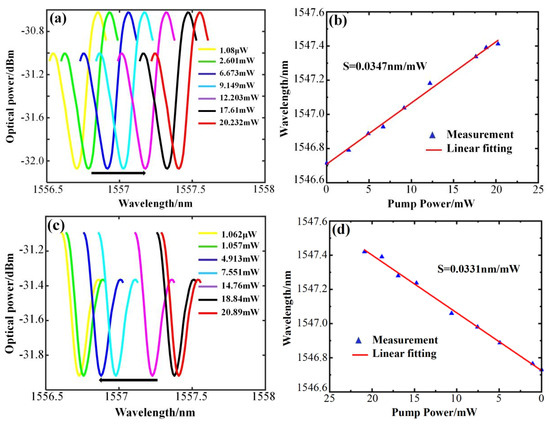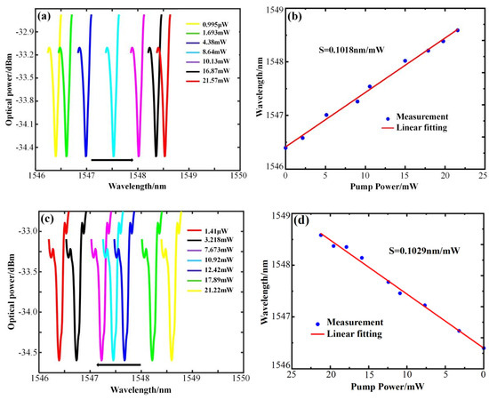For the experiment, a single–frequency fiber laser serves as the pump light source. The laser generates a continuous beam as the pump light signal, which is amplified by a high-power fiber amplifier and injected into the microcapillary channel through a 1:1 beam splitter via a half–cone fiber. The pump light power is monitored in real time using an optical power meter to control the pump light power. The resonator size is = 128 μm, = 161 μm, and has a wall thickness of 33 μm. Figure 5 displays the variation in the WGM resonance spectrum of the microcapillary resonator with power, collected as the power increases and decreases, respectively. Figure 5a shows the WGM resonant wavelength shifted toward the long-wave direction when the pump light power rises from 1.08 μW to 33.232 mW, with a red shift of 0.702 nm, and the power sensitivity is obtained as 0.0347 nm/mW by linear fitting as in Figure 5b. Figure 5c shows the WGM resonant wavelength shifts in the short-wave direction as the pump light input power decreases from 33.89 mW to 1.062 μW, with a blue shift of 0.691 nm, and the power sensitivity is 0.0331 nm/mW, obtained by linear fitting as in Figure 5d. The power sensitivities obtained during the power increase and power decrease are very close to each other, with an average sensitivity of 0.0339 nm/mW. The results show good consistency and feasibility.