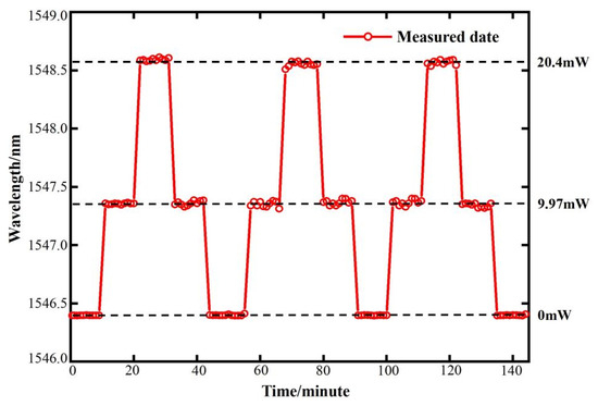 Resonant wavelength variation with time for the sensing system under 0 mW, 9.97 mW, and 33.4 mW pump optical power cycles.
