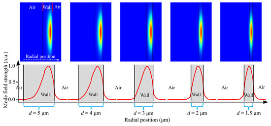 Mode field distributions of the WGMs for various wall thicknesses of microcapillary resonators.