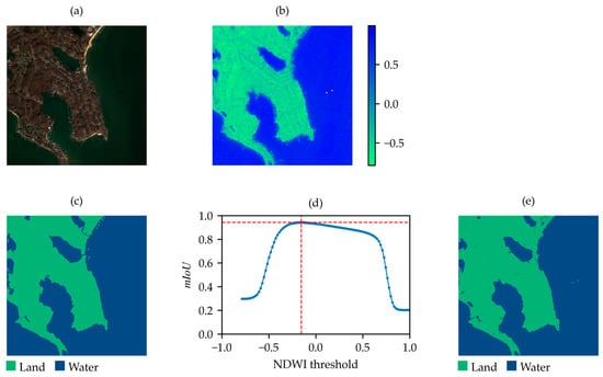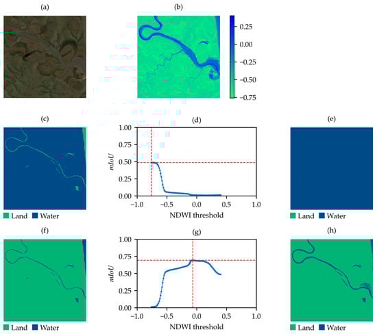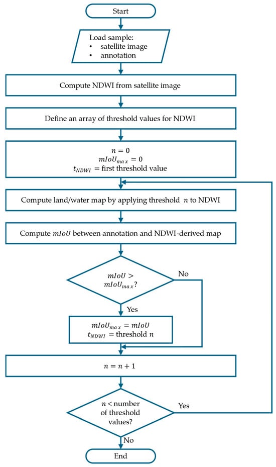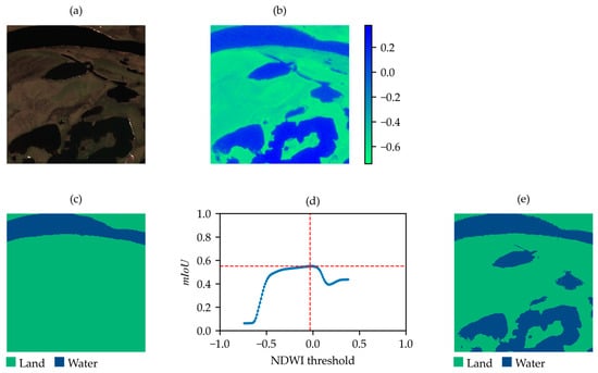 - First iteration (coarse search): 100 linearly spaced thresholds are calculated, ranging from the minimum to the maximum NDWI value for the sample. The coarse threshold estimation, , is then obtained by choosing the threshold that maximizes the .