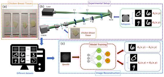 The interaction of biological scattering media with incident optical fields has long posed a significant challenge in optical imaging, remaining an interesting research topic. Dynamic particles and structural inhomogeneity within biological tissues induce multiple complex scattering events, which severely degrade image quality [1]. This scattering causes phase distortion and uneven light intensity distribution, complicating image reconstruction. In particular, owing to the dynamic scattering nature of biological tissues, conventional optical imaging techniques face limitations in recovery imaging from dynamic speckle patterns generated after passing through biological scattering media. While various optical imaging techniques, including optical coherence tomography (OCT) [2,3,4], photoacoustic imaging (PAI) [5,6,7], and fluorescence microscopy [8,9], have been employed to address this, inherent limitations remain [10], especially for the restoration of dynamic speckle patterns. Chicken breast tissue slices can serve as an effective model for simulating the behavior of biological tissues in optical imaging and measurement due to their similarities in optical properties to human soft tissues [11,12,13]. The diverse components in chicken breast exhibit different absorption and scattering coefficients, contributing to both absorption and scattering during light propagation. Additionally, chicken breast tissue demonstrates dynamic characteristics, such as minor movements or deformations due to the evaporation of water during experiments, which can affect light propagation paths and scattering patterns, thereby exhibiting dynamic scattering properties. These complexities present significant challenges for traditional optical scattering models and imaging algorithms, requiring the robustness and generalization of an imaging model [14,15,16].