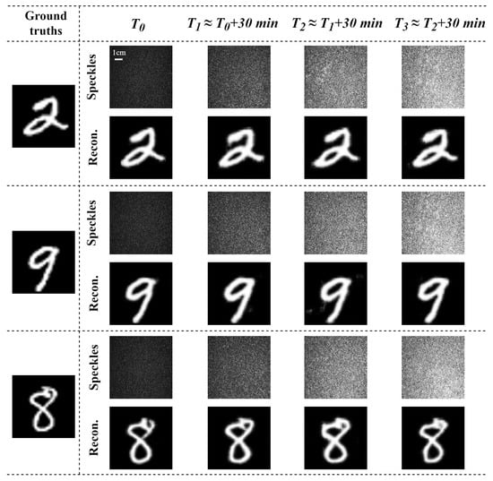The vectorial restoration of dynamic varying speckle patterns through a scattering medium of chicken breast tissue (1.0 mm thick) during different time periods was investigated. The two orthogonal polarization components of a vector optical field carry the same image information δ 1 ( x , y ) = δ 2 ( x , y ) , and the recovery results are shown in Figure 3. Based on our experimental observations of the water evaporation rate in chicken breast tissue slices, we found that the physical properties of the tissue undergo significant changes within a time frame ranging from several minutes to tens of minutes. To effectively capture these dynamic changes, we selected a 30 min interval for our experiments, which allowed us to observe and analyze the tissue’s behavior during the water evaporation process. The speckle patterns behind a chicken breast tissue across four different time periods corresponding to the same MNIST image varied significantly, due to the dynamic scattering properties of a chicken breast tissue slices over time. The experiment reconstruction results indicate that the proposed method can restore the corresponding ground truths even when the speckle patterns are dynamically varying, although the restored results slightly differ from each other, Here, we quantitatively evaluated the reconstruction results using the Pearson correlation coefficient (PCC), structural similarity index (SSIM), and peak signal-to-noise ratio (PSNR) [34,35,36] as evaluation metrics for the reconstructed images. The results are summarized in Table 1. The results demonstrate that the robustness and generalization of the Trans-CNN network significantly enhances the model’s adaptability to achieve the mapping relations for dynamically varying datasets, effectively improving the reconstruction performance.