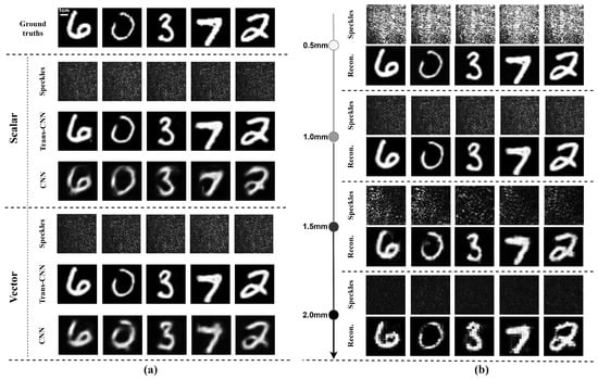 Figure 4. Reconstruction of single-phase images with Trans-CNN and CNN networks through chicken breast tissue slices using a scalar or vector optical field. (a) Feconstructed results with Trans-CNN and CNN networks through 1.0 mm thick chicken breast tissue slices using a scalar or vector optical field; (b) reconstruction results with Trans-CNN network through varying thicknesses of chicken breast tissue slices using a vector optical field.