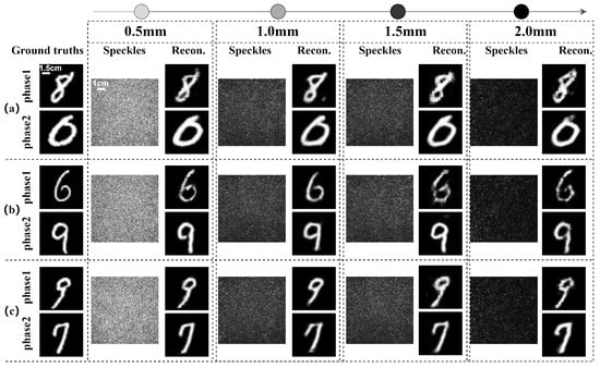 Figure 5. Reconstruction of dual-phase images of orthogonal polarization components using the Trans-CNN network passing through chicken breast tissues with different thicknesses. Three various sets of test datasets are adopted in (a), (b) and (c), respectively.