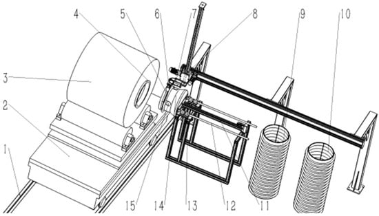 Overall process structure 1. Rail 2. Lifting and rotating steel coil conveyor trolley 3. Steel coil 4. Steel coil inner sheath 5. Large V-shaped clamping jaws 6. Finger cylinder 7. Ninety-degree flip cylinder 8. Linear module 9. Steel coil inner sheath silo A 10. Steel coil inner sheath silo B 11. Servo motorized cylinders 12. Motorized cylinder guides 13. Slide bearings 14. Rubber head 15. Electromagnet.