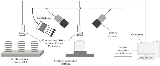 With the continuous advancement of computing, robotics, and automation technologies, the automation level in steel coil packaging lines has been steadily increasing. Currently, most processes in advanced steel coil packaging production lines overseas are fully automated. However, only a small number of foreign steel companies have automated the installation of the inner corner of steel coils [,,]. Moreover, high costs remain a significant challenge. The primary issue lies in the absence of a reliable steel coil end face position detection system, which hinders accurate detection and adjustment of both the steel coil end face and inner corner positions. Therefore, the development of a high-precision, robust position detection system is crucial.