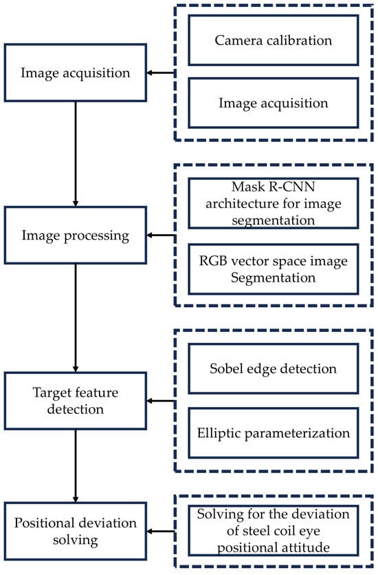 The visual detection module’s process primarily involves several key steps: camera parameter calibration, acquisition of scene image information by the visual sensor, transmission of the scene map to the visual detection system, and application of image processing algorithms to extract the parameter information of the rolled eye. Specifically, the image processing phase consists of two main steps: image segmentation to identify the region of interest and solving for ellipse parameters. Once the end face image parameter information is obtained, a coordinate transformation is required. This involves translating and rotating the target features from the image coordinate system to the base coordinates of the steel coil corner guard installation equipment, as per the hand-eye calibration. Ultimately, this process yields the deviation information between the end face of the steel coil and the corner guard end face. The comprehensive visual inspection solution is illustrated in Figure 3.
