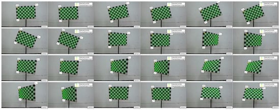 First, the camera is calibrated using specific parameters. This study employs Zhang Zhengyou’s plane calibration method to conduct camera calibration experiments. The calibration process, illustrated in Figure 4, involves the following steps: initially, the calibration plate is positioned at various attitudes; subsequently, corner points are detected; and finally, the calibration results are derived through computational analysis.