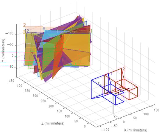 The extracted corner points are utilized to fit and derive the camera’s parameter matrix. In the equations, the parameters for the left and right cameras are distinguished by the subscripts l and r, respectively.