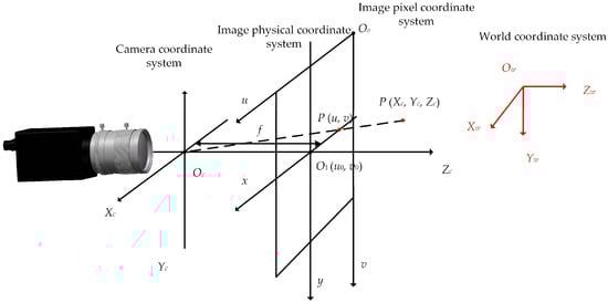 A spatial coordinate system was established to derive the camera’s imaging model. The machine vision system encompasses four primary coordinate systems: the world coordinate system, which represents the absolute coordinates of three-dimensional points in the scene as (Xw, Yw, Zw); the camera coordinate system, which describes the relative position of objects within the camera, with the three-dimensional coordinates of a scene point P denoted as (Xc, Yc, Zc); the image physical coordinate system, whose origin O1 (u0, y0) is situated at the center of the image plane, with the x-axis and y-axis aligned parallel to the u-axis and v-axis of the image pixel coordinate system; and the image pixel coordinate system, which delineates the coordinates of image pixels, with the coordinates of scene point P expressed as (u, v) [].