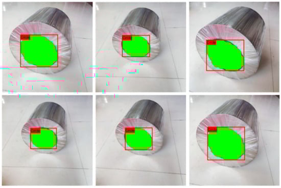 The images in the test set were evaluated using the trained target detection network, with the results displayed in Figure 12. The mounting area of the steel coil was effectively segmented from the background, demonstrating accurate recognition. The mask fit for the test set was high, indicating excellent performance.