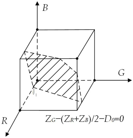 The shaded portion of Figure 12 represents the plane defined by the equation f (zR, zG, zB) = zG − (zR + zB)/2 − D0 = 0, the region encompassing this segmentation plane and the lower-left section of the area is the target color region. If a pixel’s color vector falls within this region, its logical value is P(z) = 1, indicating that it will appear as a white region after binarization, signifying the region of interest. Conversely, if the color vector lies outside this region, the logical value is 0, and post-segmentation binarization, this part of the pixel point forms the black background region.