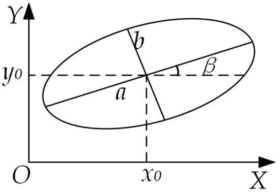 The figure (x0, y0) illustrates the coordinates of the ellipse’s center. Here, (a) denotes the semi-major axis (half-length axis) of the ellipse, (b) signifies the semi-minor axis (half-short axis), and (β) represents the angle between the major axis of the ellipse and the horizontal axis, with counterclockwise direction considered positive.
